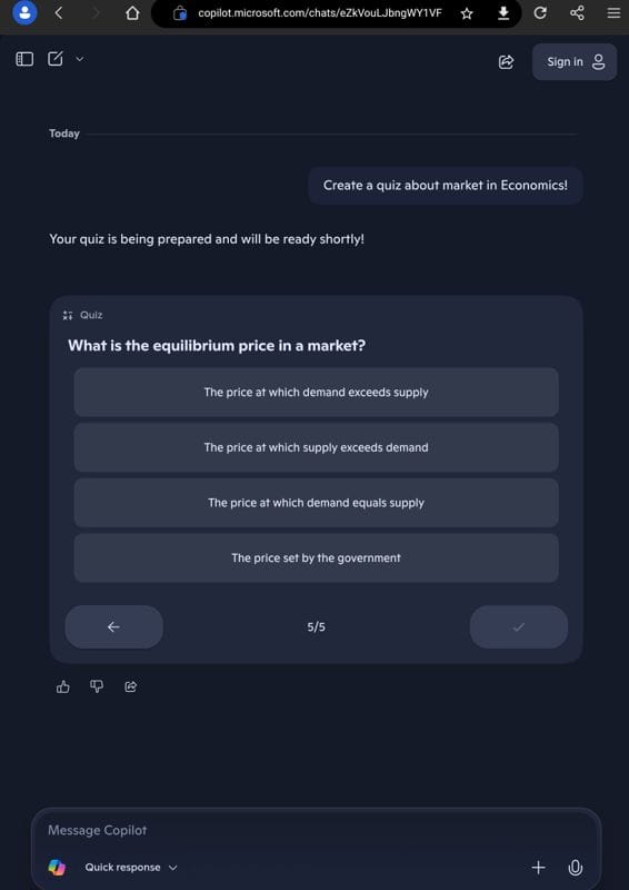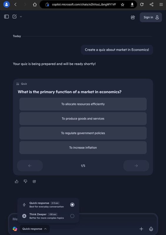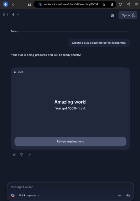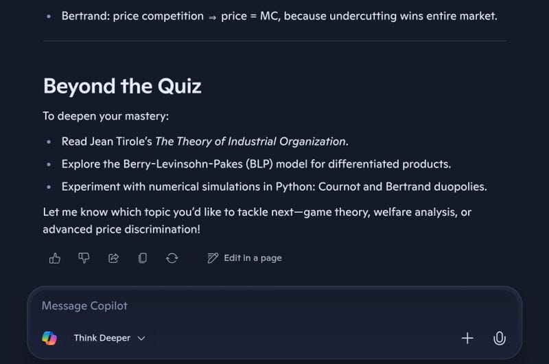 Copilot bahkan menutup quiz versi sulitnya dengan rekomendasi untuk studi lebih lanjut.